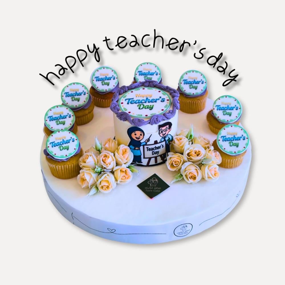 كيكه يوم المعلم - كيك مع توزيعات كب كيك